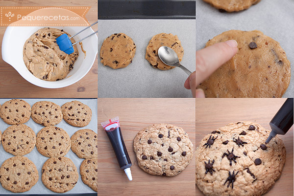 - Para las cabezas de araña elegid algunos de los chips de chocolate que se vean más grandes. Dejamos secar.