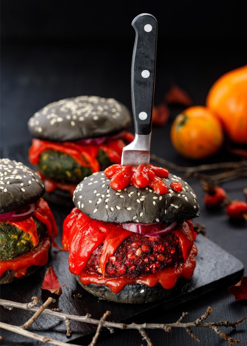 Esta hamburguesa sangrienta de Halloween es perfecta para adultos que buscan un plato impactante y aterrador. Con pan negro, hamburguesa de remolacha y decorada con “sangre” de ketchup, es el plato ideal para una noche de terror. ¡El toque del cuchillo la hace aún más dramática!