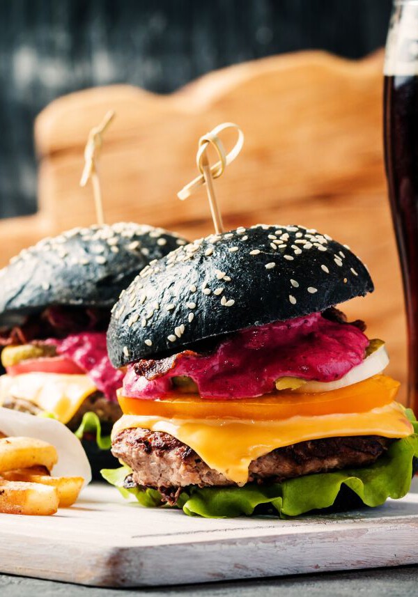 Preparación: Cocina la hamburguesa y coloca sobre el pan negro. Añade rodajas de cebolla y pimiento rojo asado para simular sangre y vísceras. Coloca la tapa del pan y decora con abundante ketchup para un efecto sangriento. Si quieres un toque extra, clava un cuchillo en la parte superior de la hamburguesa para un look terrorífico y sirve de inmediato. ¡Espeluznante y delicioso!