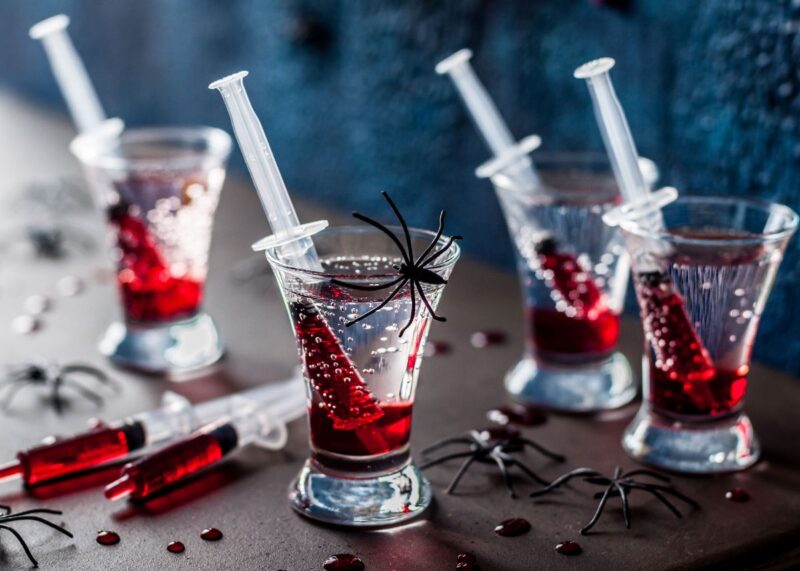 Llenamos las jeringuillas con vodka y licor de frambuesa. En cada vaso, servimos refresco de lima-limón y añadimos la jeringuilla con “sangre” para que cada invitado mezcle su propio trago. ¡Salud y horror!