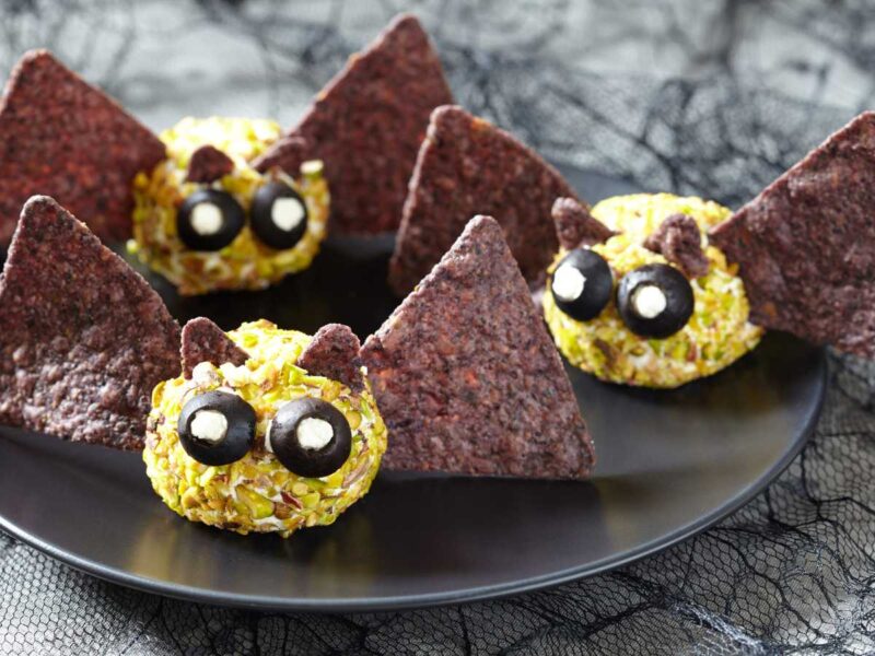 Preparación: Mezclamos el queso crema y cheddar hasta integrar bien. Podemos añadir las especias que más nos gusten. Otra opción es comprar algún queso crema de sabores, por ejemplo finas hierbas. Formamos bolitas, las cubrimos con pistachos picados y decoramos con aceitunas para los ojos y un toque de crema agria en el centro. Añadimos los chips de tortilla como alas, ¡y listo!