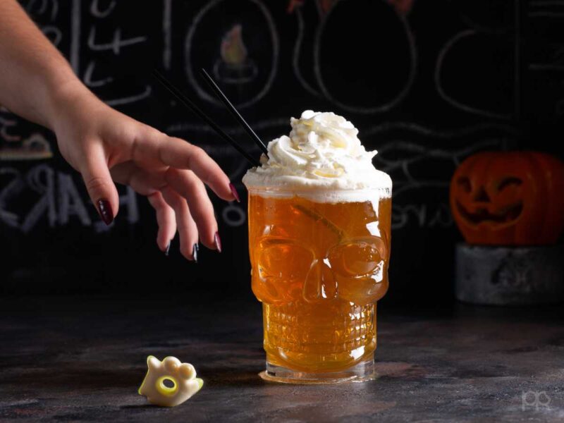 Esta cerveza de Halloween es un capricho espeluznante para adultos. Con un toque cremoso y dulce en la parte superior, esta bebida es perfecta para quien quiera algo más que la típica cerveza. En un vaso de calavera, ¡parece que bebes una pócima mágica!