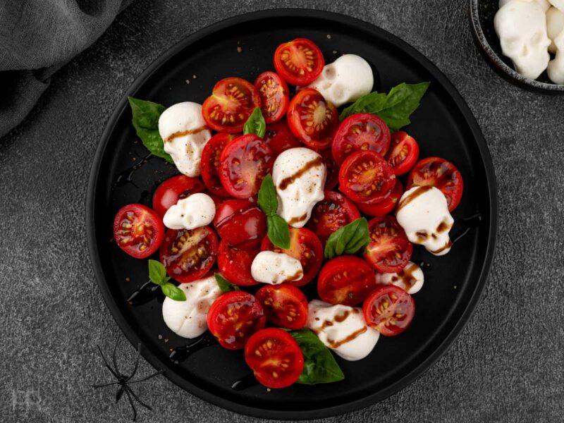 Esta ensalada caprese de Halloween es perfecta para quienes buscan algo ligero y divertido en su mesa. Con tomates cherry, hojas de albahaca y bolitas de mozzarella en forma de calaveras, tiene el toque espeluznante ideal sin perder el sabor fresco y mediterráneo. ¡Un plato sencillo y terroríficamente delicioso!