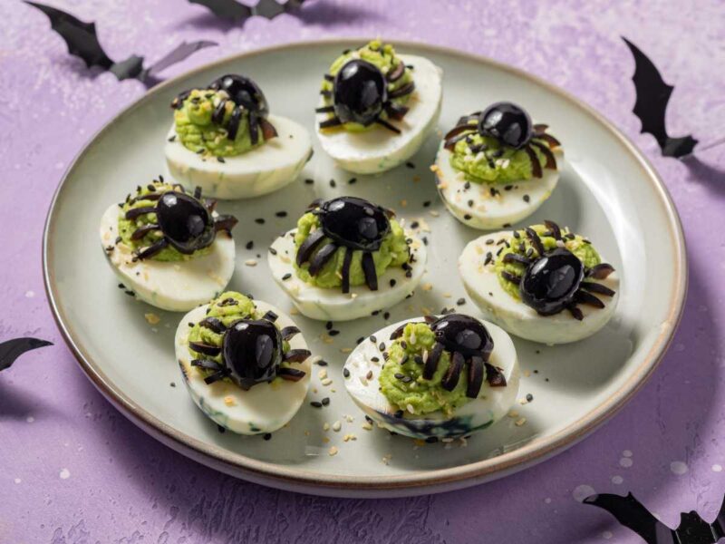 Preparación: Corta los huevos cocidos por la mitad y retira las yemas. Mezcla las yemas con aguacate, un chorrito de limón, sal y pimienta hasta obtener una crema suave. Rellena los huevos con esta mezcla. Corta las aceitunas por la mitad para el cuerpo de la araña y en tiras finas para las patas. Coloca una mitad de aceituna en cada huevo y rodea con las tiras para simular una araña. Decora con semillas de sésamo si lo deseas y sirve. ¡Listos para asustar y deleitar!
