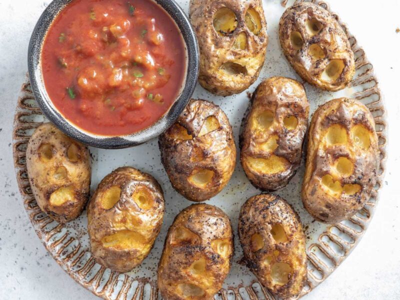 Preparación: Precalienta el horno a 200°C. Lava bien las patatas y sécalas. Con un cuchillo o una cucharita, realiza cortes en forma de ojos y boca para simular caras. Coloca las patatas en una bandeja, úntalas con aceite de oliva y espolvorea con sal, pimienta, ajo en polvo y pimentón. Hornea durante 30-40 minutos o hasta que estén doradas y tiernas. Sirve con salsa de tomate para mojar y disfruta de un aperitivo de Halloween espeluznante.
