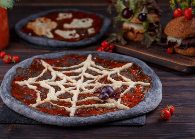 Preparación: Extiende la masa de pizza negra y cúbrela con una capa de salsa de tomate. Coloca el queso mozzarella en una manga pastelera o bolsa de plástico con un corte pequeño y dibuja una telaraña sobre la pizza. Hornea a 200°C hasta que la masa esté crujiente y el queso derretido. Decora con una “araña” hecha con aceitunas negras en el centro. ¡Sirve caliente y sorprende a todos!