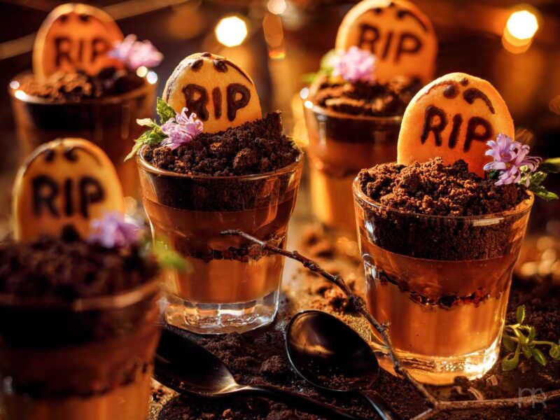 - Toques finales: Si quieres añadir un toque extra, puedes colocar ramitas de menta fresca o pequeñas flores comestibles junto a la “lápida” para darle un aire aún más tétrico y realista.