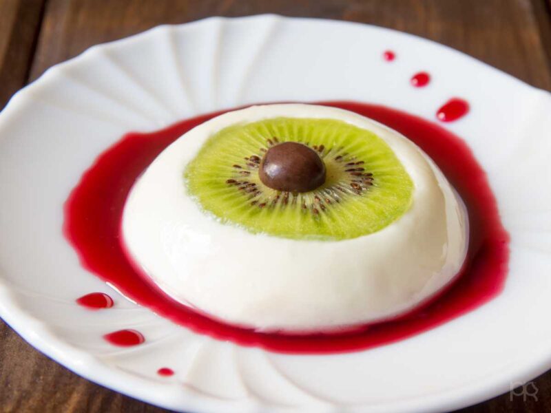 Este postre de Halloween es tan fácil como espeluznante: ¡un “ojo” en plato! Con una base suave de panna cotta, un kiwi simulando el iris y un toque de coulis de frutos rojos para darle un efecto sangriento, es perfecto para un toque aterrador y delicioso en tu mesa.