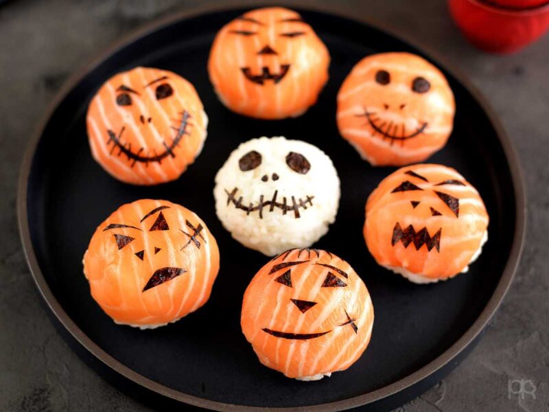 Preparación: Cocina el arroz para sushi y mézclalo con una pizca de vinagre de arroz, azúcar y sal. Forma pequeñas bolas de arroz y cubre cada una con una lámina de salmón para simular la piel de una calabaza. Corta el alga nori en pequeños trozos y úsalos para crear caras en el sushi, dibujando ojos, bocas y detalles espeluznantes. ¡Listos para servir y sorprender en Halloween!