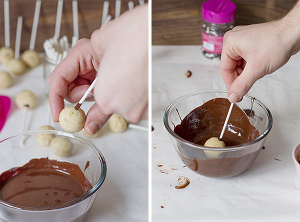 - Transcurrido el tiempo fundimos el chocolate al baño maría y bañamos una de las puntas de los palos, clavamos el palito de cake pop (puedes comprarlos aquí) dentro de la bola.