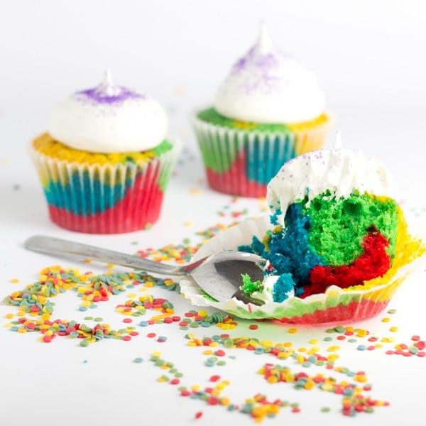 Y finalizamos nuestro tour por estas recetas llenas de color con estas magdalenas de colores, otra idea original para celebrar este día tan especial: