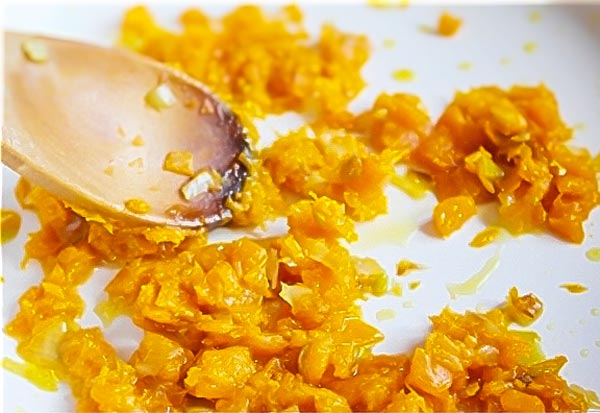 Lo primero que haremos será pelar la calabaza y cortarla en cubitos.