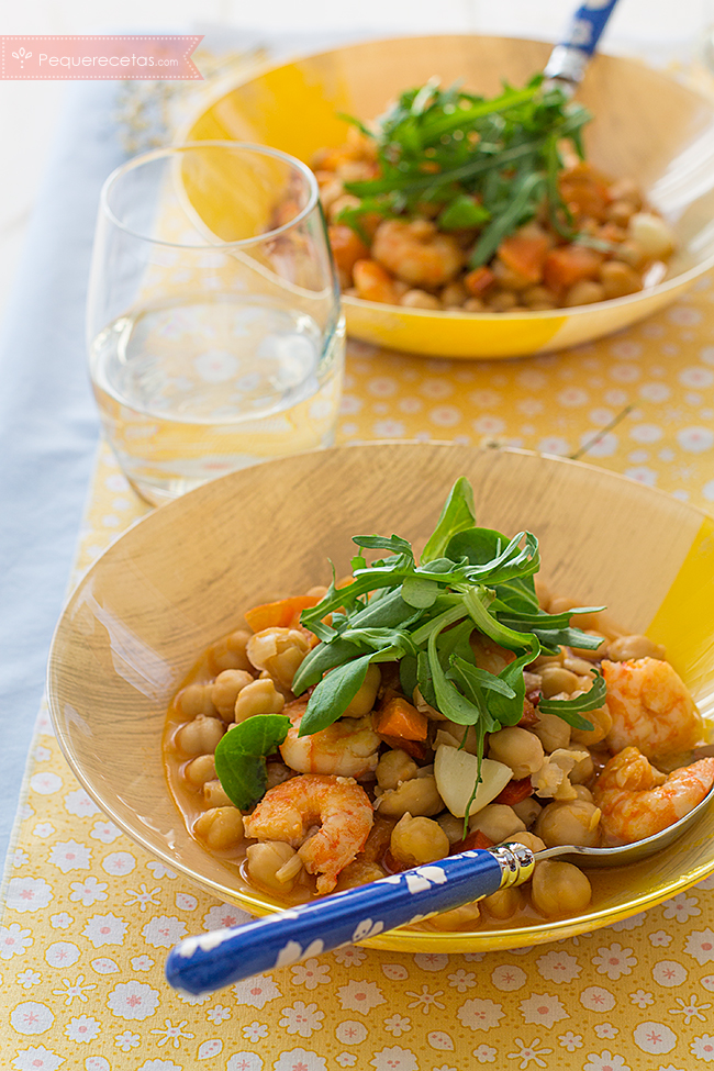 Esta receta con garbanzos es una de mis favoritas. Este guiso de garbanzos con langostinos es una receta completa con sabores tradicionales y caseros: