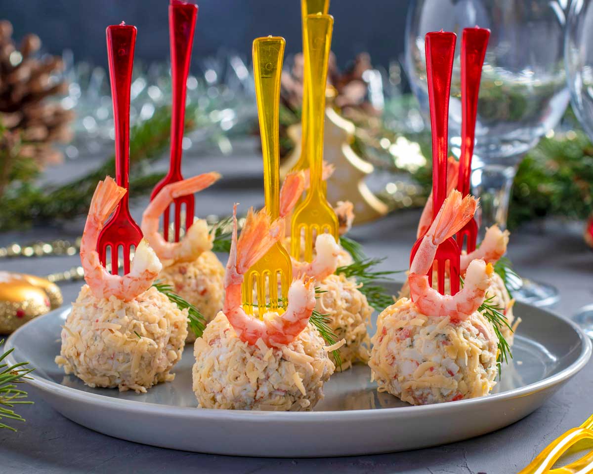 Otra opción es preparar unas bolitas de queso crema, con huevo rallado y palitos de cangrejo. Remata las bolitas con un langostino y pínchalas con un tenedor de aperitivo o con un palillo de cóctel.