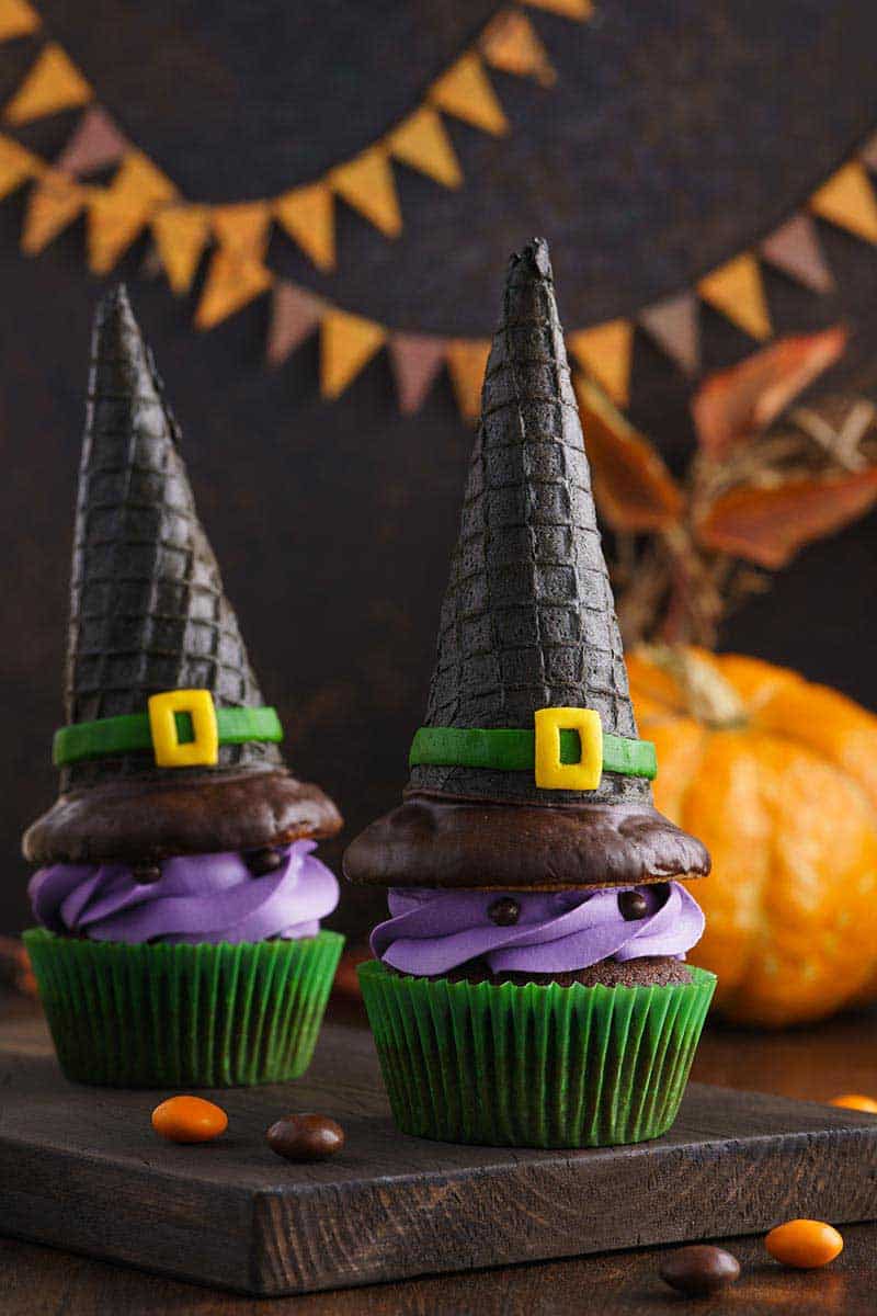 Con la misma idea de los sombreros de bruja de arriba puedes hacer estos simpáticos cupcakes de Halloween de brujas. Si eres habilidoso con la manga pastelera prepara un frosting para los cupcakes y añade dos perlitas de chocolate para los ojos.