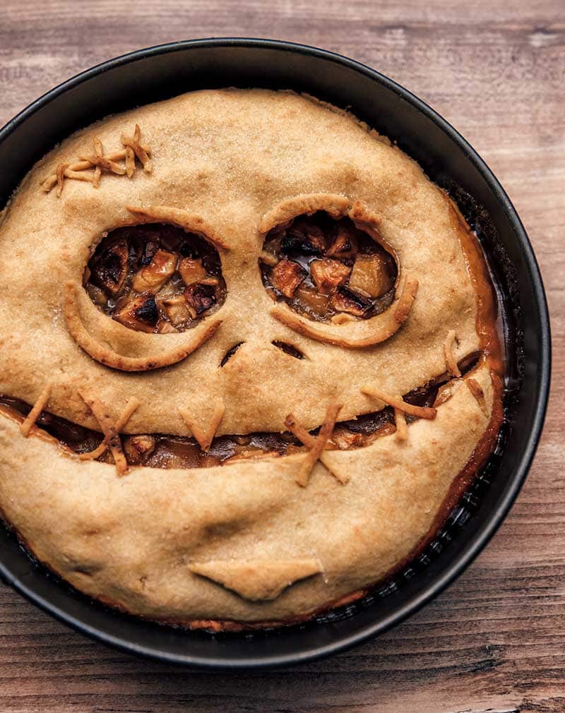 Pero si hay algo que triunfa como postre de Halloween son las tartas, ¿quién no disfrutaría de un pastel de manzana como el de arriba? Hay que reconocer que da mucho miedo, pro rico está un rato. Para hacerlo sigue la receta de la clásica apple pie o tarta de manzana americana, y cuando hayas colocado la capa de arriba dale la forma de la imagen de arriba ¡es muy sencillo!