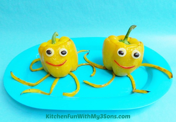 Si tenéis pensado preparar pimientos rellenos, podéis darles un toque divertido simplemente decorándolos como simpáticos pulpitos, usando trocitos de pimiento cortado en juliana para los tentáculos, circulitos de queso y oliva para los ojos y una tira de pimiento rojo o tomate para la boca.