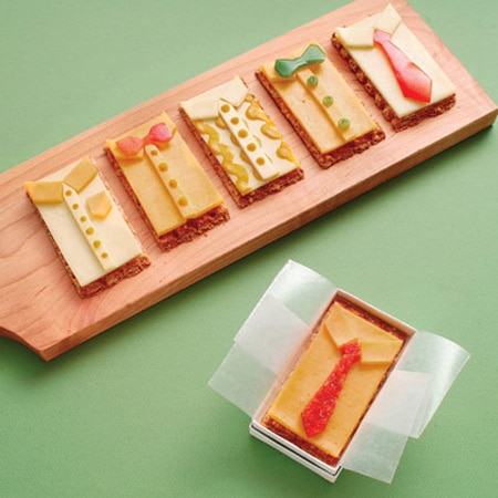 Luego recortáis, utilizando esa misma base de referencia, una loncha de queso del mismo tamaño, y a partir de ahí es vuestra imaginación y la de vuestros hijos la que os permitirá hacer divertidas “camisas de papá” como éstas. Para ello podéis recortar con ayuda de un cuchillo y algo de salami una corbata, o una pajarita utilizando pimiento rojo o verde… Los cuellos de la camisa los podéis hacer superponiendo algo de queso, y los botones con unas gotitas de mostaza y un palillo.