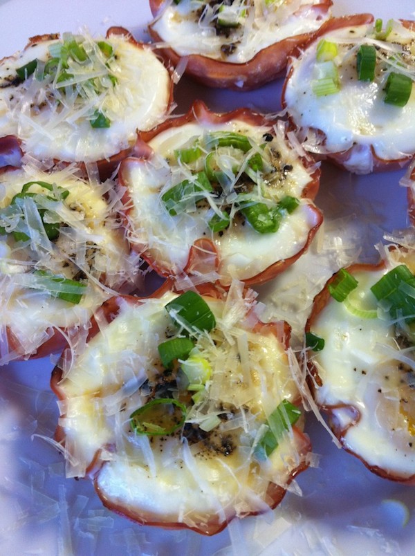 ¡Estas magdalenas o muffins son una cena rapidísima! Cogéis el molde de magdalenas aceitado, ponéis dentro de cada tacita una loncha de jamón de york, presionándola para que coja la forma y echáis dentro un huevo. Condimentáis con sal y pimienta y lleváis al horno precalentado a 200°. El tiempo de cocción depende de cómo os gustan de cocidos los huevos, con unos 12 minutos deberían estar cuajados. Cuando servís, podéis espolvorear con queso en polvo y cebolleta rehogada.
