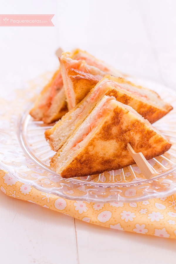 Ingredientes: 2 rebanadas de pan de molde; 2 lonchas de salmón ahumado; 2 lonchas queso mozzarella; huevo batido