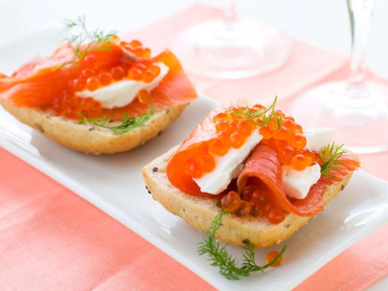 Preparación: Tuesta el pan y cubre con salmón ahumado, trocitos de queso crema y huevas de salmón. Decora con eneldo y sirve. ¡Listo en minutos!