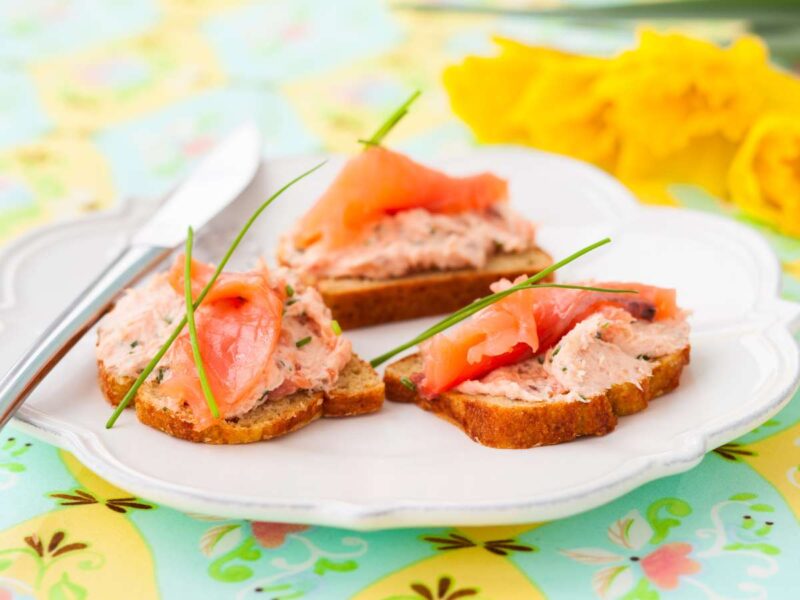 Y si quieres rematar la receta prepara unos canapés con el paté de salmón, unas lonchitas de salmón ahumado y una ramita de cebollino.
