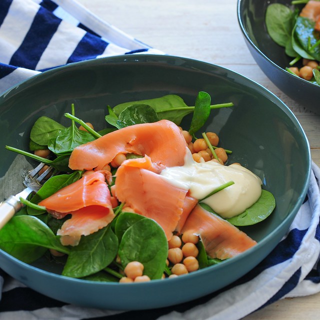 Preparación: en un plato grande o una fuente disponemos las espinacas, los garbanzos y rociamos con una mezcla de zumo de limón y aceite. Salamos y mezclamos con delicadeza, servimos con el salmón por encima y si os gusta una cucharada de mayonesa.