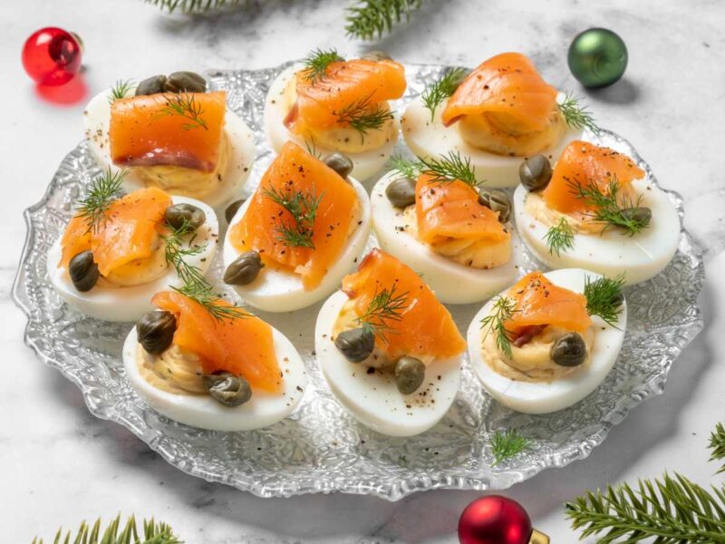 - Coloca un trocito de salmón ahumado sobre cada huevo relleno. Decora con una alcaparra y una ramita de eneldo fresco. Si te gusta, añade un toque de pimienta negra molida por encima.