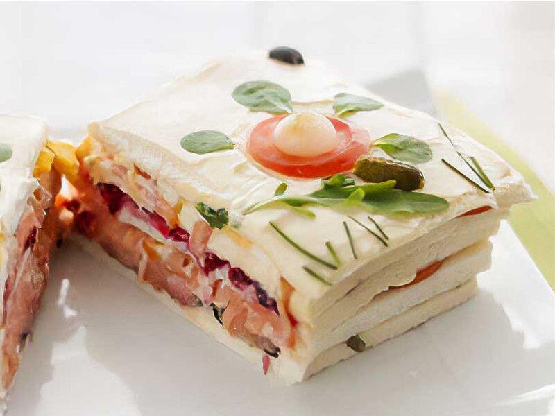 Preparación: este pastel frío es muy sencillo, solo tenemos que ir intercalando capas de pan con mayonesa y el relleno, la receta del pastel de salmón ahumado la encontráis aquí: