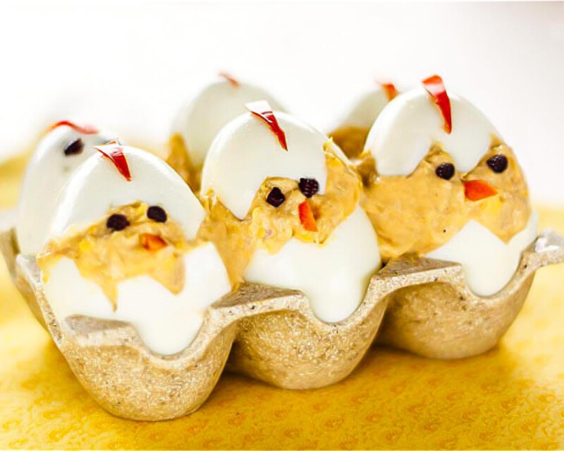 De primero, te propongo unos pollitos de Pascua. Como ves, se trata de unos ricos huevos rellenos con atún y mayonesa pero presentados de manera original. Si utilizas un cartón de huevos para servirlos, ¡se verán aún más reales!