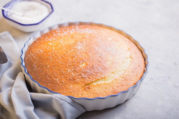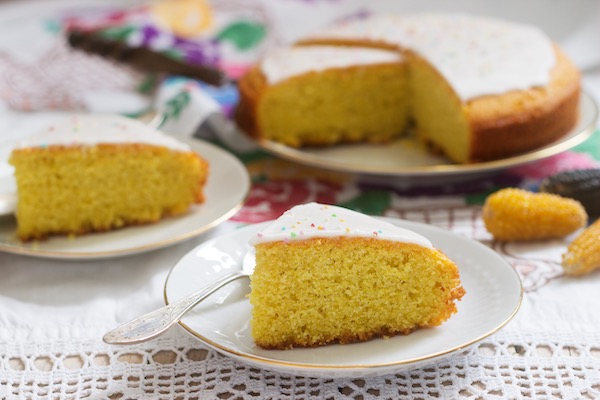 Ingredientes: 320 g de harina de maíz; 1 sobre (16 g) de levadura química sin gluten (tipo Royal); 2 huevos; 200 ml de leche; 75 g de mantequilla; 75 g de aceite de oliva suave; 220 g de azúcar; 1 pizca de sal; la cáscara rallada de un limón o una naranja.