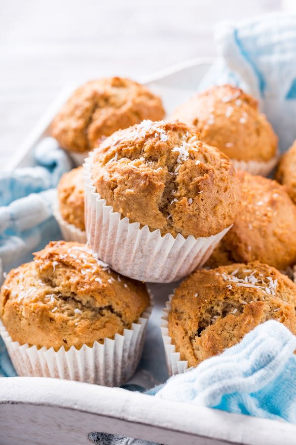 Ingredientes para 10 magdalenas: 2 manzanas cortadas en cubos; 2 huevos + 2 claras; 85 g de harina de trigo sarraceno; 40 g de coco rallado; 1 cucharada de canela en polvo; 1 cucharadita de esencia de vainilla; 50 g de azúcar (podéis reemplazarla con un edulcorante)