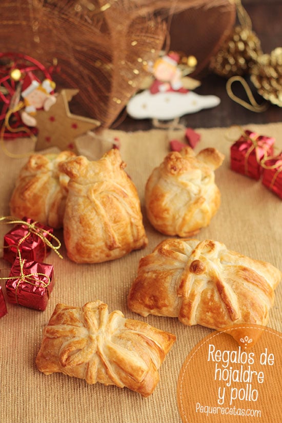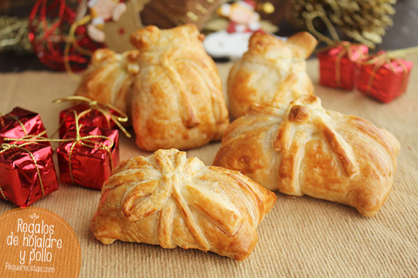 Es una idea riquísima y muy divertida para estos días de fiesta, estos regalos navideños elaborados con hojaldre son muy crujientes por fuera y por dentro, un delicioso relleno de pollo con un poco de cebolla y unas especias, muy jugoso y sabroso.
