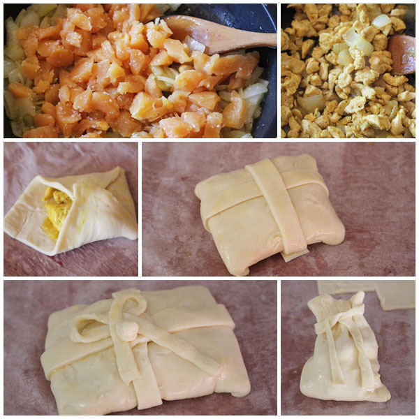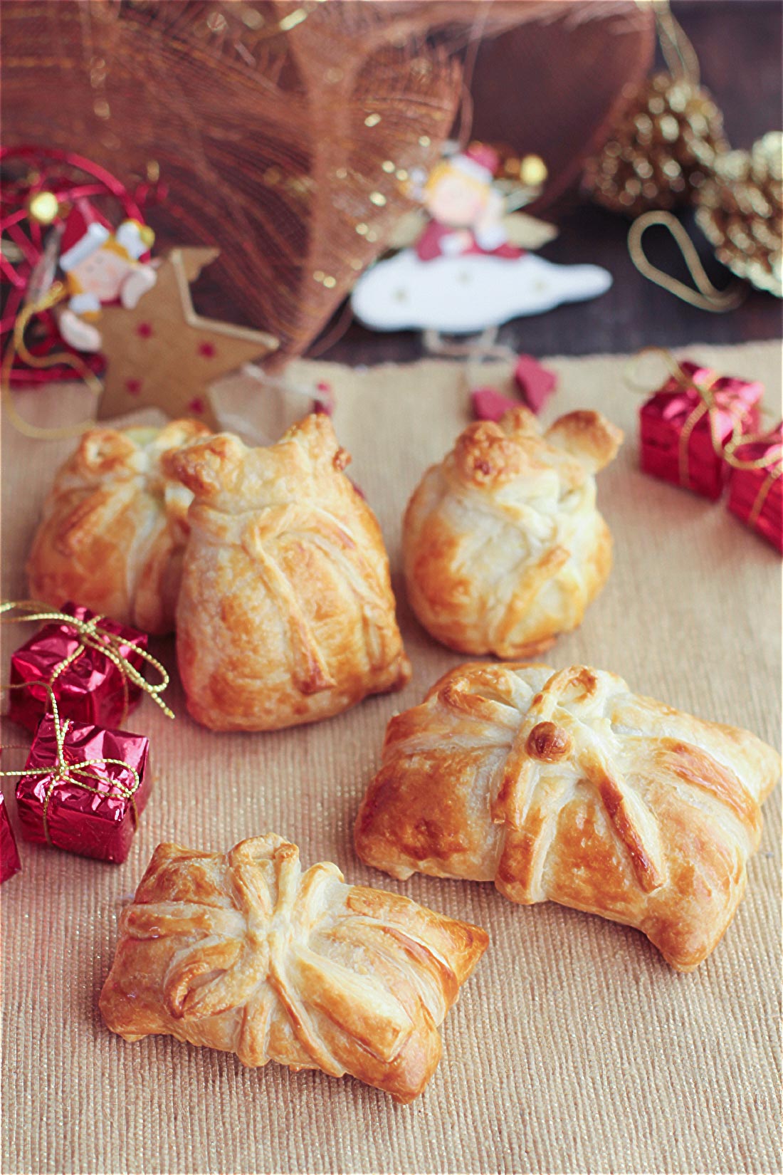 - Cerramos formando un paquete, con unas tiras de hojaldre hacemos como si fuera un regalo.