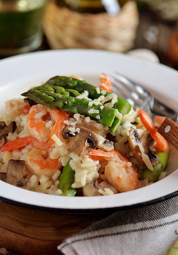 Este arroz cremoso es simplemente delicioso y si tenéis Thermomix, lo haréis en un abrir y cerrar de ojos. Hacer risotto con Thermomix es una gran idea porque esta receta necesita movimiento constante ¿Qué me dices, prepararás este risotto de gambas y espárragos o un risotto de champiñones en Thermomix?