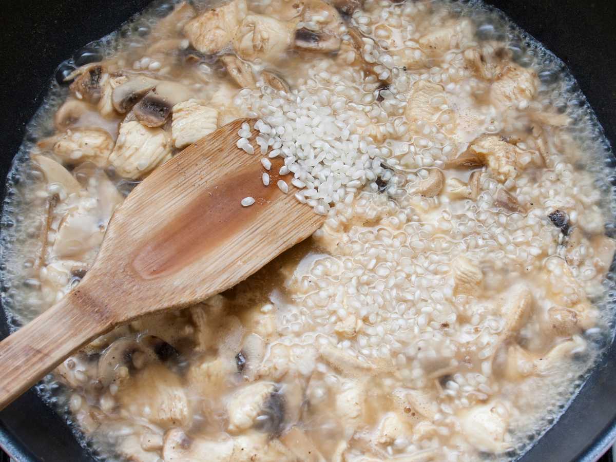 - Incorporamos el vasito de vino blanco y un cucharón de caldo de pollo caliente que habremos preparado previamente, removiendo hasta que se evapore, unos 5 minutos.