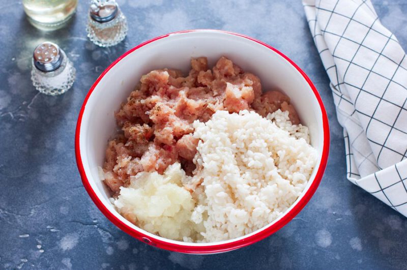 - En un bol grande, mezcla la carne picada, el arroz cocido, y la cebolla picada. Añade sal y pimienta al gusto.