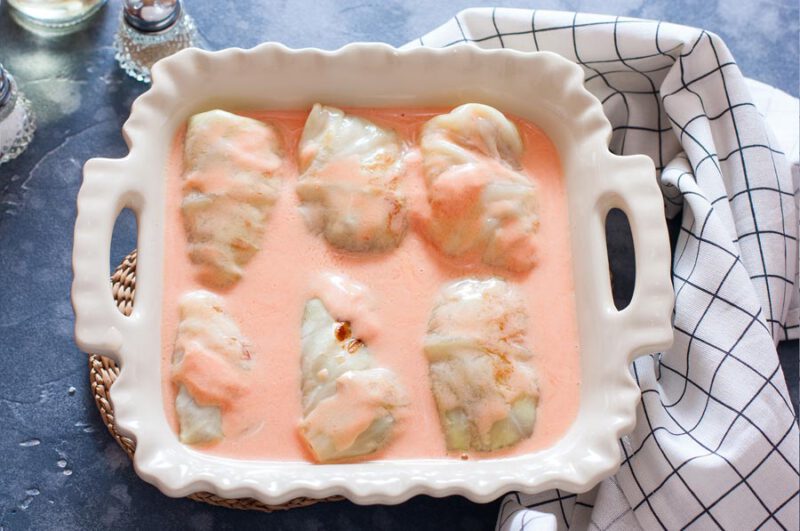 - Coloca los rollitos de col encima y cubre con el resto de la salsa.
