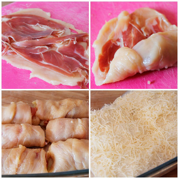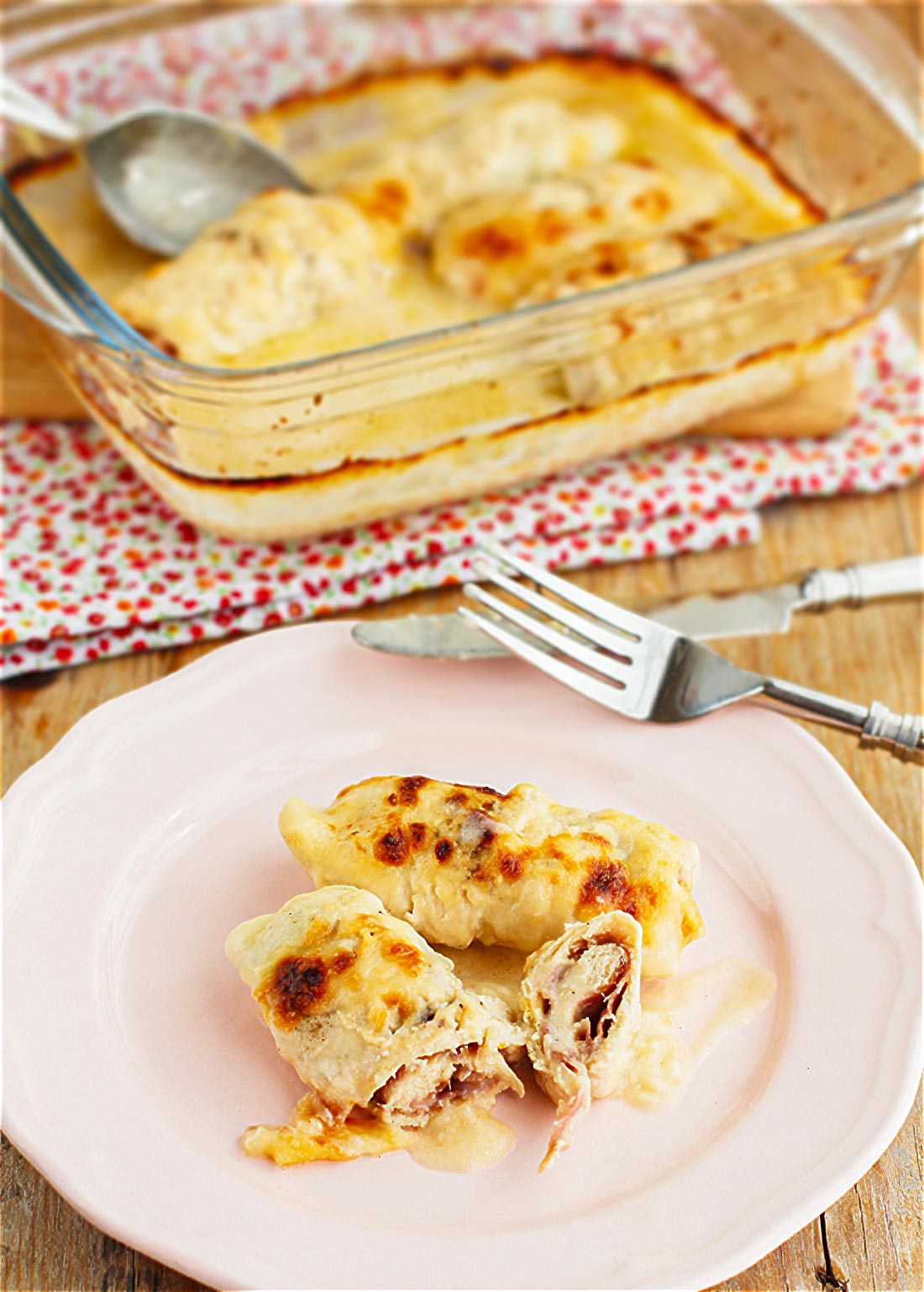 Tan sólo tenemos que extender los filetes de pechuga de pollo, poner unas lonchas jamón de serrano y enrollar, deben ser muy finos, los cubriremos con salsa bechamel y vuestro queso favorito por encima, una perfecta receta de pollo para niños y para toda la familia, ya que así queda muy jugoso y sabroso.