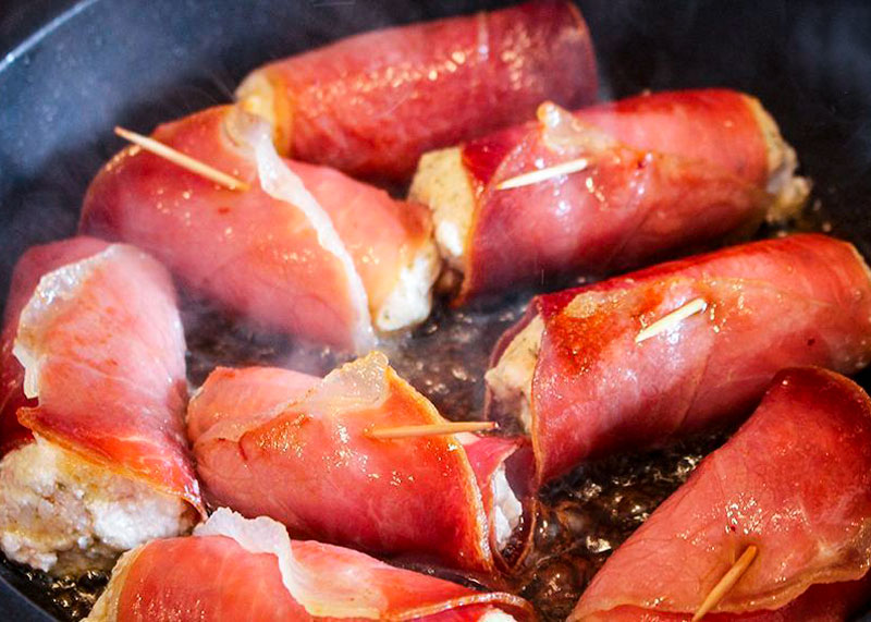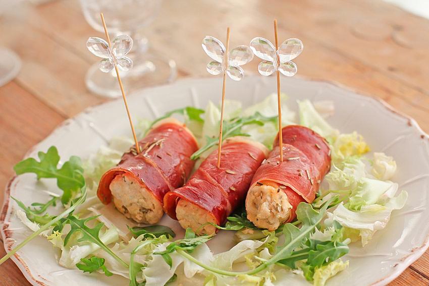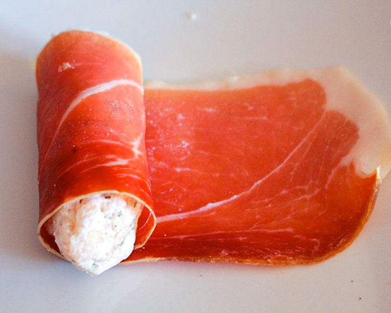 - Ponemos sobre una loncha de jamón serrano y enrollamos formando un cilindro. Si queréis, podéis ponerle un palillo para aseguraros de que no se abren.