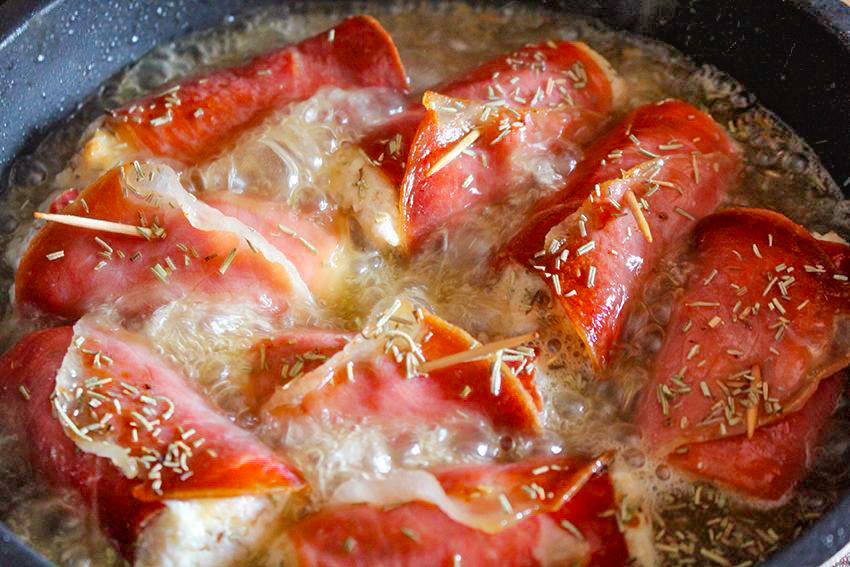 - En una sartén ponemos un poco de aceite de oliva virgen extra y doramos los rollitos, una vez que están dorados, añadimos el vino y un poco de romero.