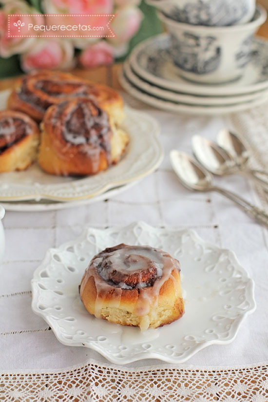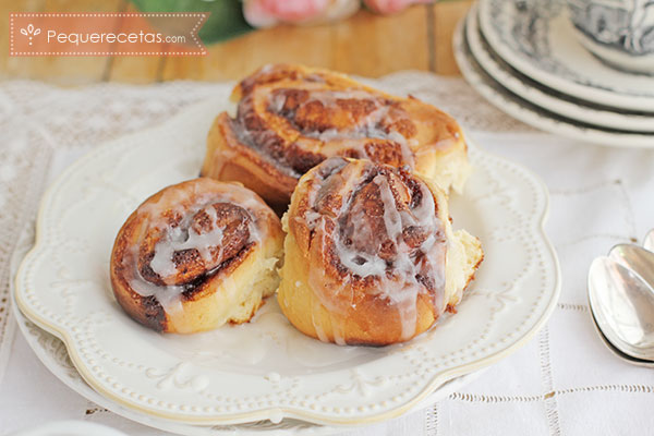 En cuanto se enfríen un poco podréis disfrutar estos deliciosos rollos de canela con vuestro glaseado o frosting favorito. ¡Riquísimos! Los podéis acompañar de un gran vaso de leche para la merienda o acompañando al café si sois los mayores quienes vais a disfrutar de ellos.