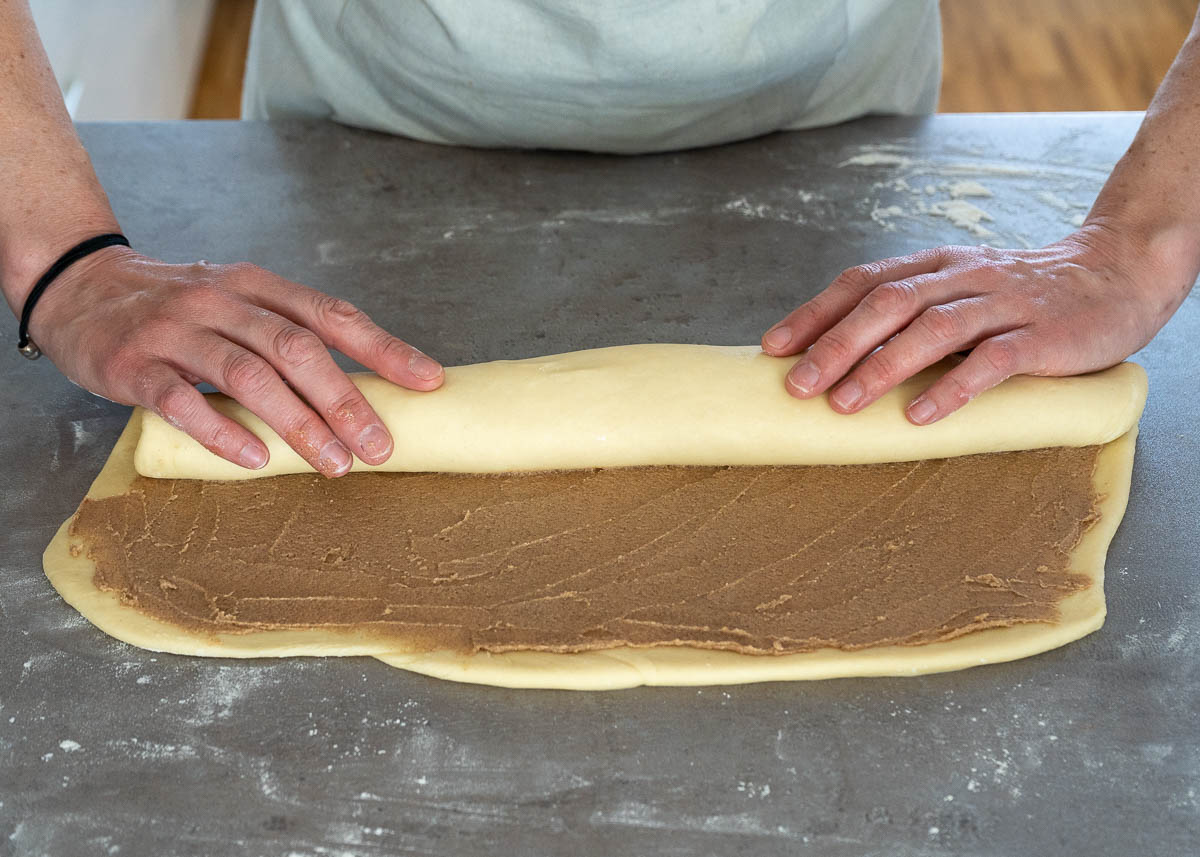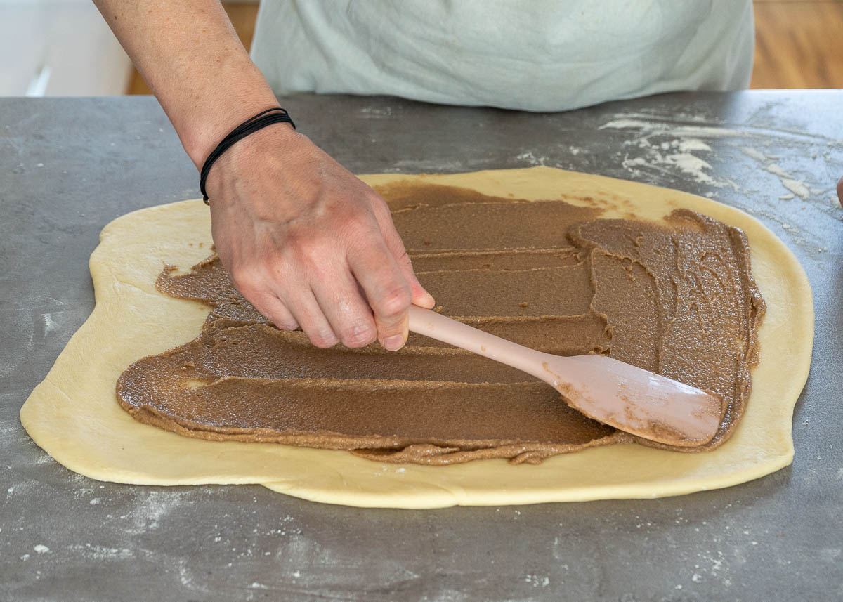 - Con una espátula untamos el relleno de canela, azúcar y mantequilla sobre la masa, dejando un borde de aproximadamente 1 centímetro sin rellenar.