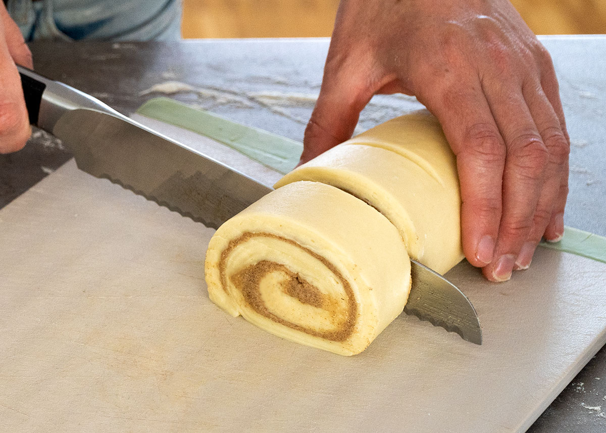 - Con un cuchillo cortamos el cilindro de masa en porciones de aproximadamente 3 cm de grosor. Nos saldrán entre 10 o 12 porciones.