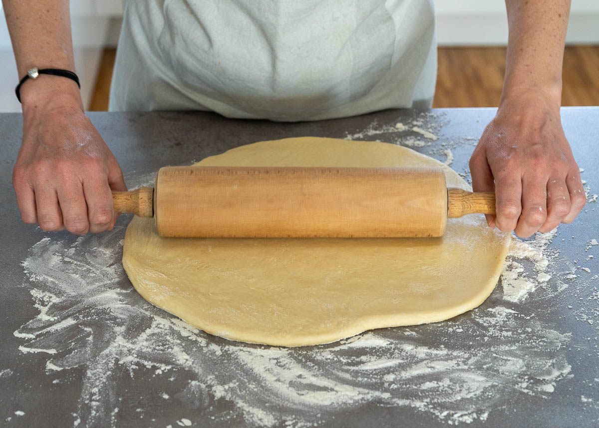 - Una vez nuestra masa ha levado, la estiramos con ayuda de un rodillo, formando un rectángulo de aproximadamente 30x40cm.