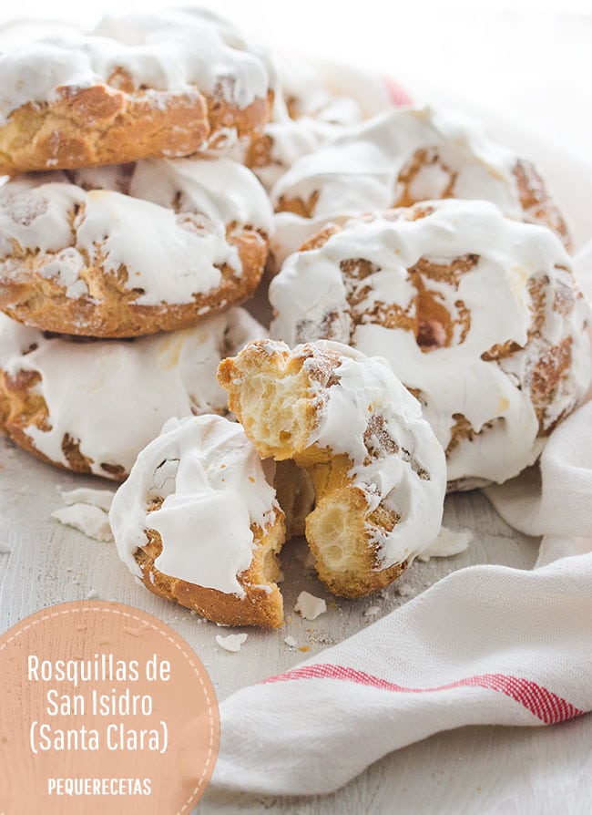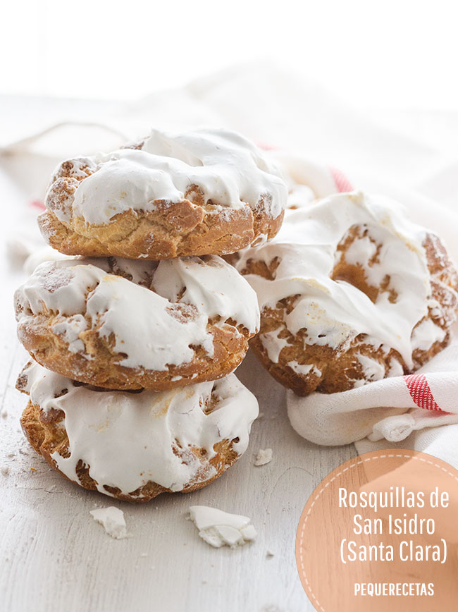En San Isidro es típico comer rosquillas. Y aunque las más conocidas, quizás por la curiosidad del nombre son las rosquillas tontas y listas, hay otras dos variedades, que son las francesas (con un rebozado de granillo de almendra), y las rosquillas de Santa Clara, que son las que vamos a hacer hoy y que por el merengue blanco que llevan por encima quizás son las más llamativas de las cuatro variedades.