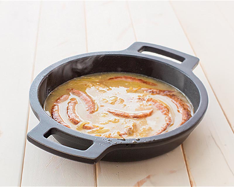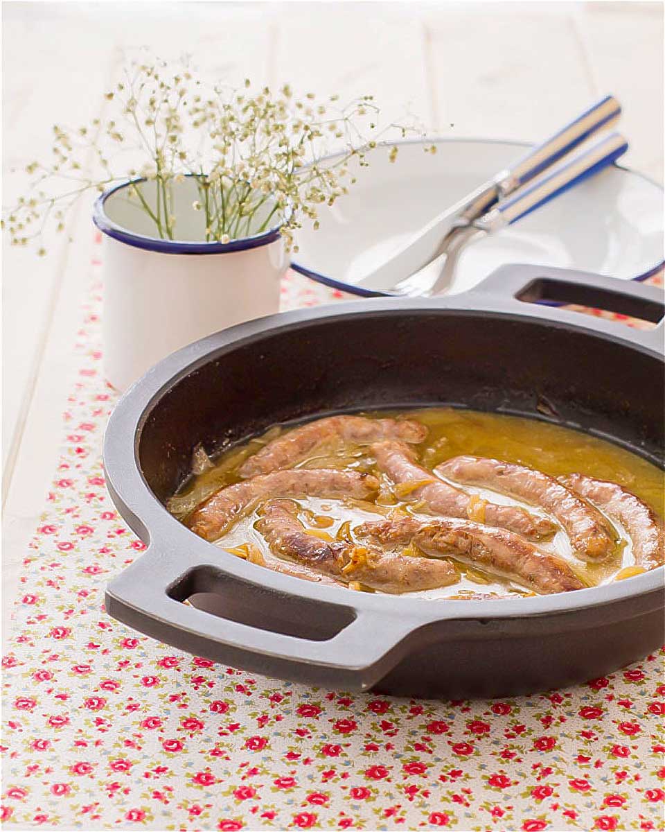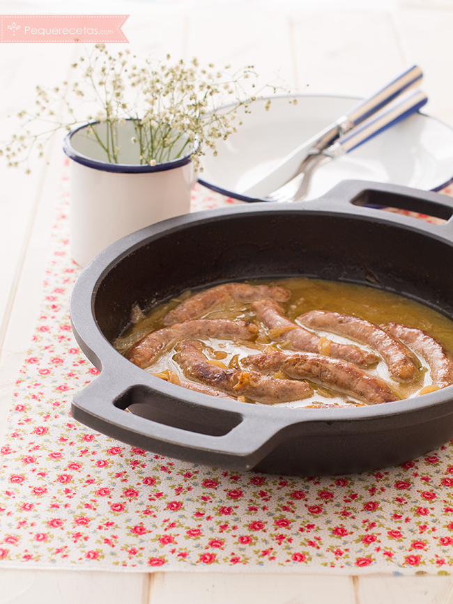 Servimos calientes las salchichas acompañadas de la salsa de vino blanco con cebolla.