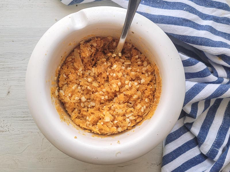 - En un bol mediano, combina las avellanas, el queso parmesano, el pan rallado, el ajo, el perejil, el zumo de limón y el aceite de oliva.