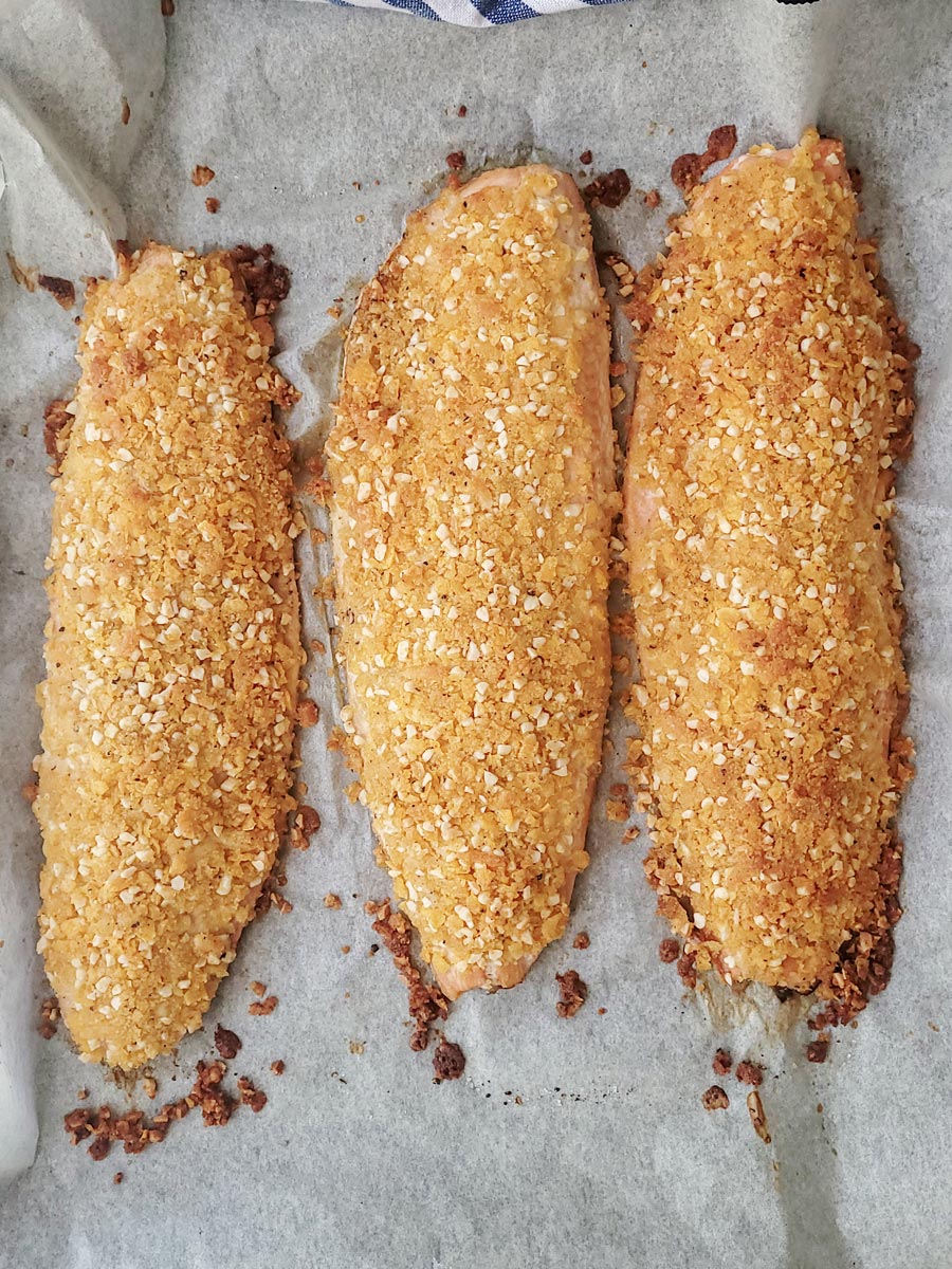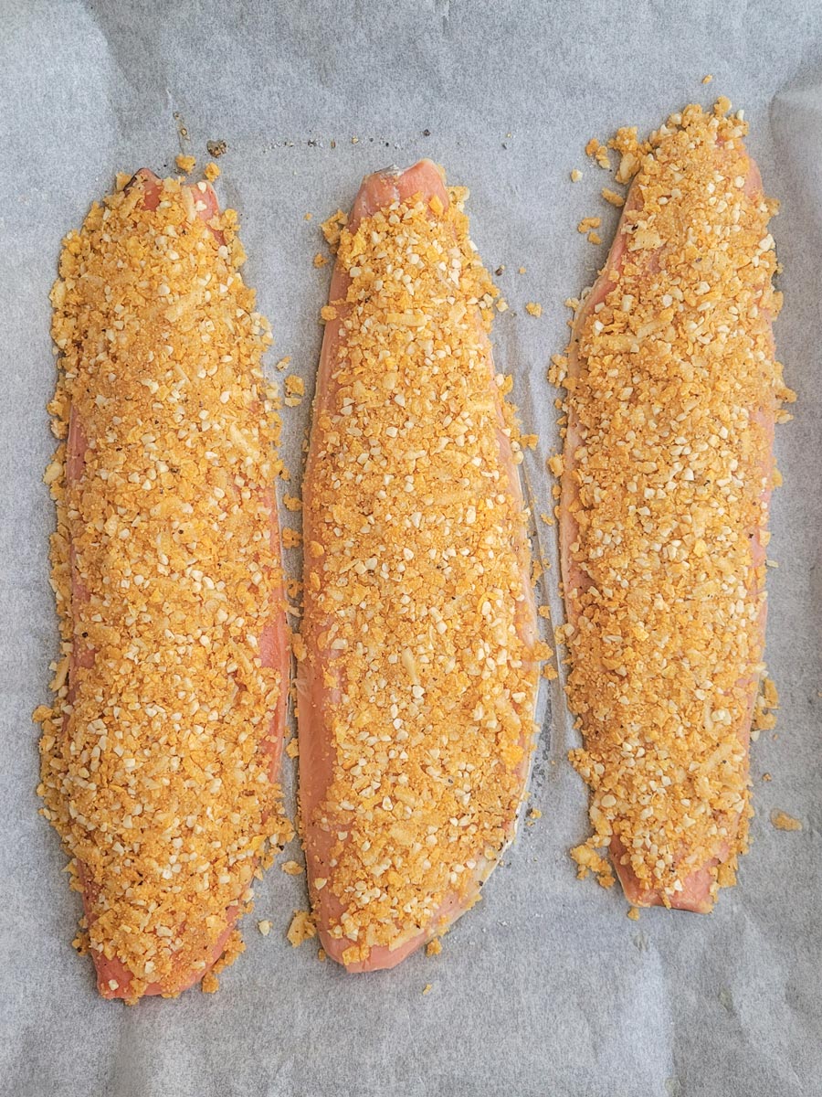 - Repartimos la mezcla de costra sobre la parte superior de cada filete, presionando ligeramente con una cuchara para que quede bien adherida.