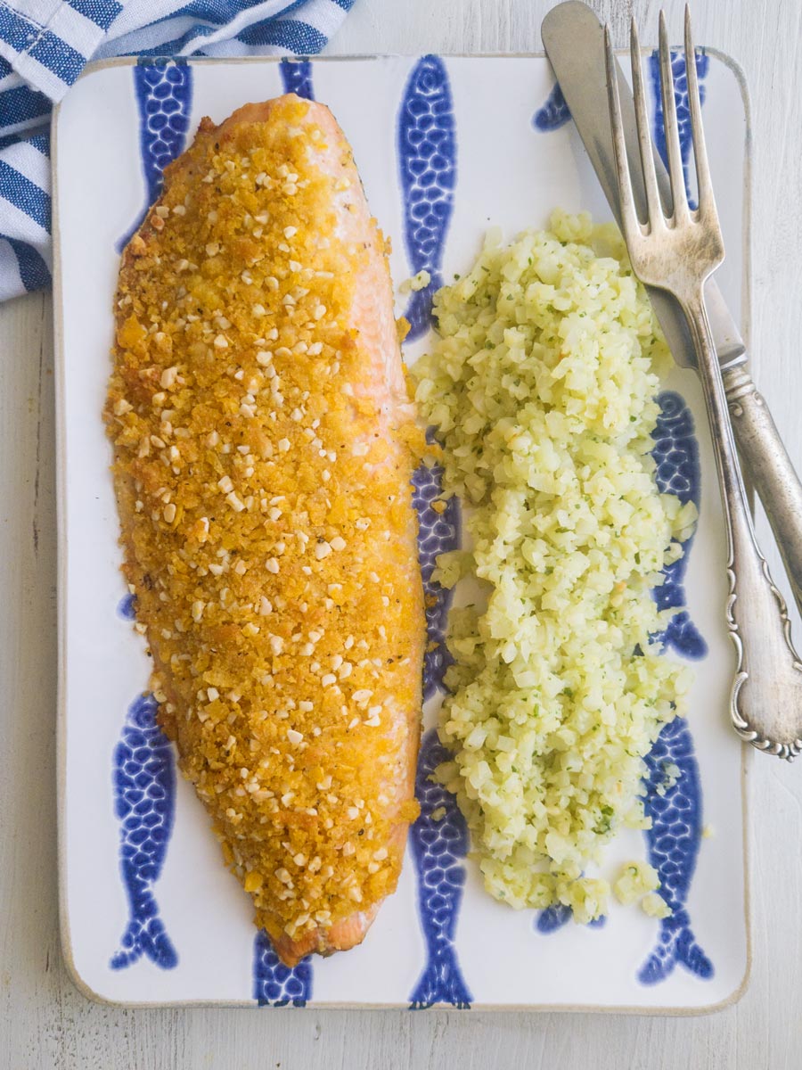 Espero que disfrutes de esta receta de salmón con costra de avellanas y queso parmesano.